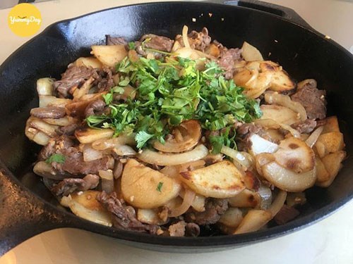 - Bước 3: Tiến hành xào khoai tây với thịt bò + Cho dầu vào chảo phi thơm tỏi, cho phần khoai tây và cà rốt vào xào đều khoảng 2 phút thì thêm nước vào xào và nêm gia vị cho đến khi chín. Nếu các bạn cắt khoai tây hơi dày thì có thể xào lâu hơn một chút để khoai tây chín mềm. Để thịt bò mềm và ngon hơn các bạn nên xào với lửa to. + Tiếp đến, để cho món ăn thêm phần bắt mắt các bạn cho rau cần, hẹ và hành lá vào xào chung. + Cuối cùng, cho thịt bò vào xào và đảo đều tay cho thịt bò nóng. Nêm nếm lại cho vừa ăn rồi tắt bếp.