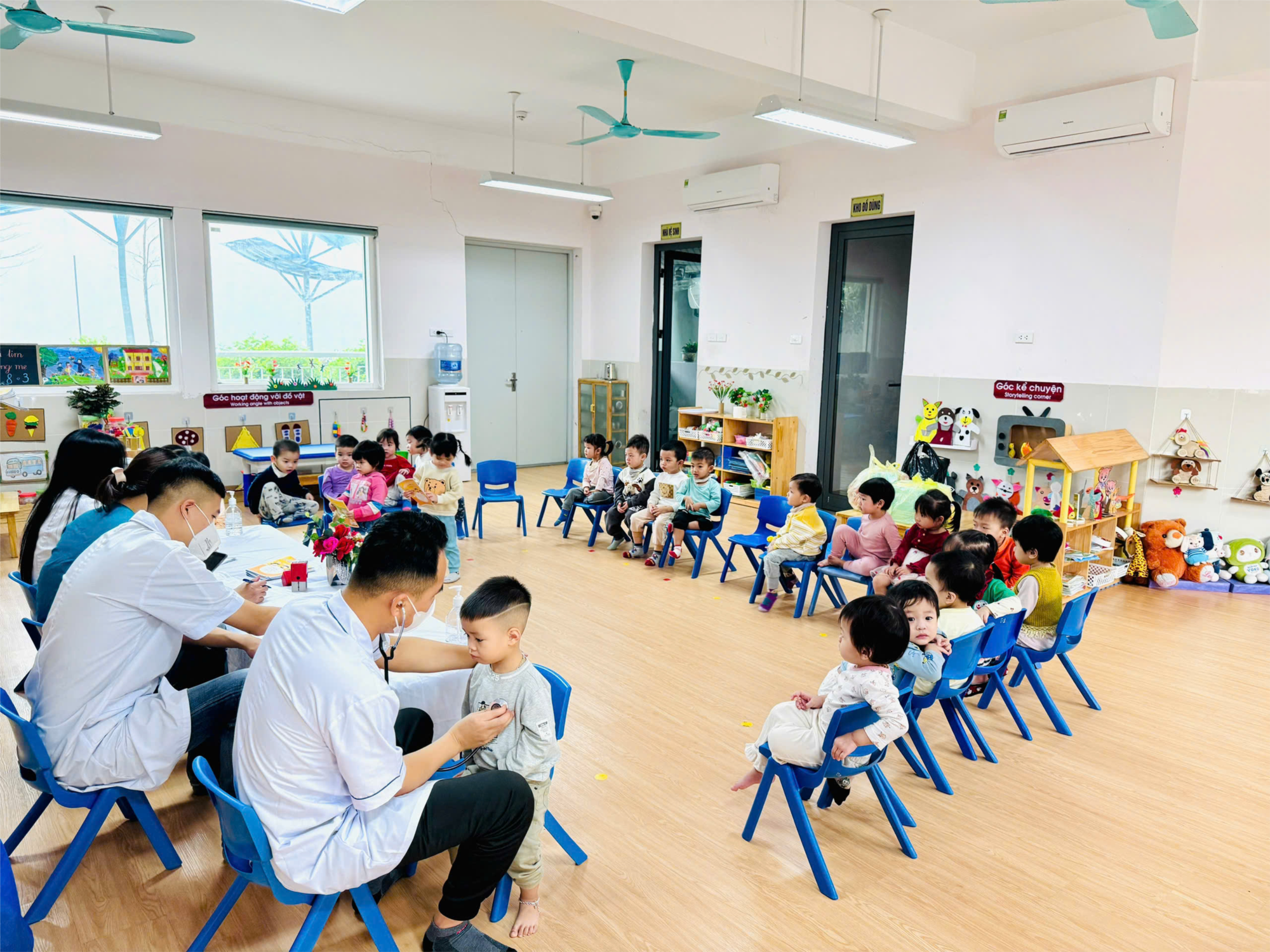 Hôm nay, các con lớp D1 khám sức khỏe định kỳ năm học 2024-2025 với những nội dung sau: Cân nặng, chiều cao, khám tai, mắt, mũi, họng, kiểm tra tim và một số bệnh liên quan đến đường hô hấp, da liễu… Kết quả cho thấy hầu hết các bé đều có sức khỏe tốt, đó cũng là niềm vui và hạnh phúc của các cô giáo và của gia đình. Khám sức khoẻ định kỳ cho các trẻ là hết sức thiết thực và ý nghĩa thông qua việc khám sức khỏe định kỳ cho trẻ đã góp phần không nhỏ vào việc nâng cao nhận thức cho phụ huynh về ý thức phòng chống một số bệnh thường gặp ở lứa tuổi mầm non và cũng qua hoạt động này đã đem lại sự phấn khởi, tin tưởng trong các bậc phụ huynh về một môi trường giáo dục an toàn và thân thiện.