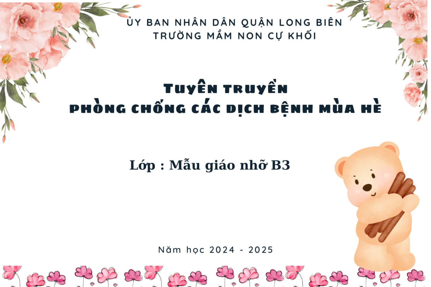 Các bậc phụ huynh thân mến! Mùa hè có nhiều loại dịch bệnh phát sinh và dễ lây lan như: tiêu chảy, bệnh tả, sốt xuất huyết, quai bị, thủy đậu, viêm đường hô hấp....Con người rất dễ bị nhiễm bệnh do điều kiện vệ sinh môi trường, ý thức vệ sinh cá nhân, vệ sinh an toàn thực phẩm, nếu như không biết cách phòng tránh thì sẽ rất dễ mắc bệnh, đặc biệt là trẻ mầm non. Vậy để hạn chế các bệnh dich mùa hè, chúng ta cần thực hiện những biện pháp phòng bệnh như sau: