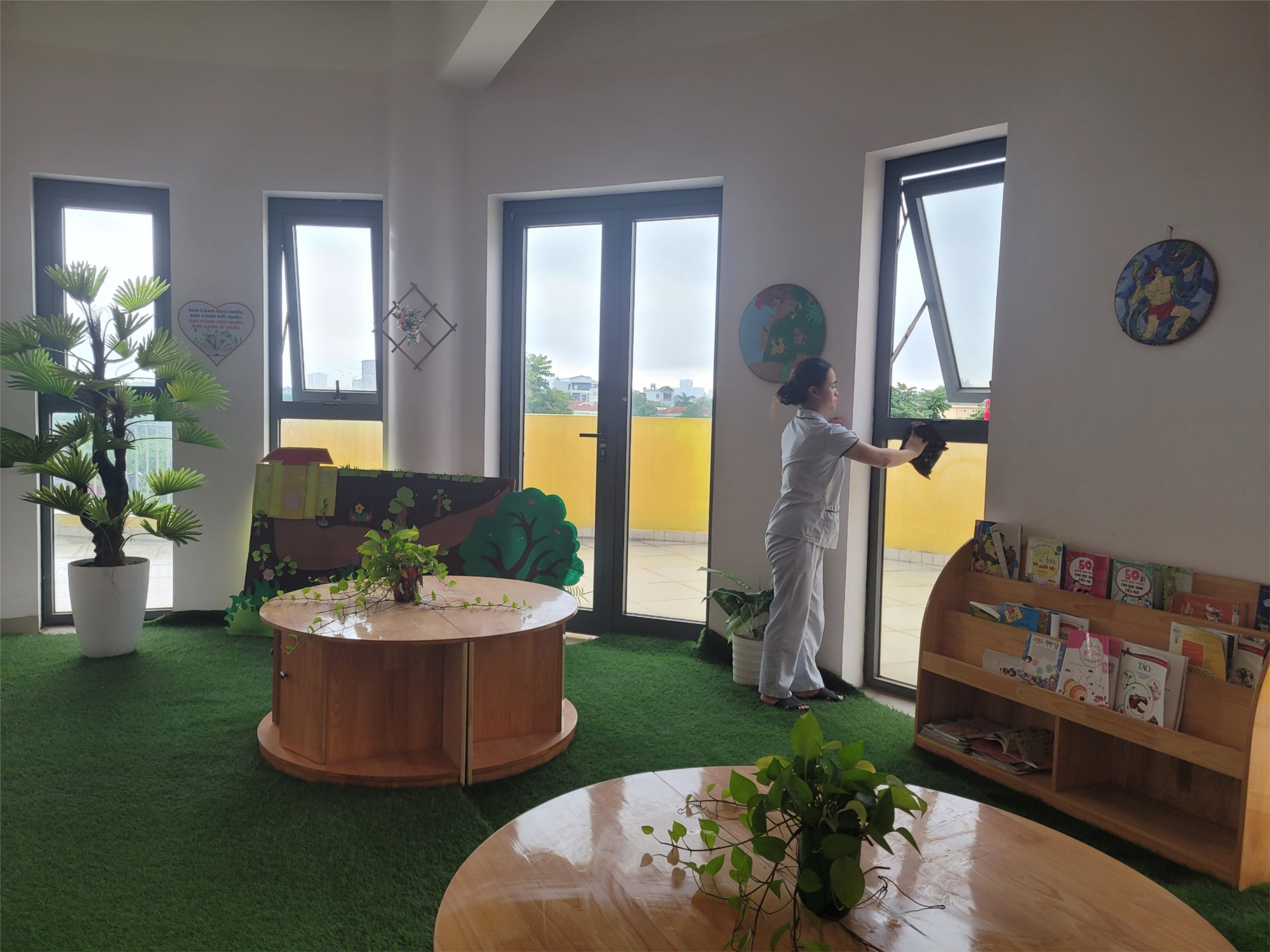 Hiện nay, dịch bệnh Bạch hầu đang bắt đầu xuất hiện. Cả nước đã ghi nhận 1 trường học tử vong do bệnh Bạch hầu tại tỉnh Nghệ An. Để chủ động phòng chống dịch bệnh này, ngoài việc tuyên truyền, phổ biến kiến thức đến GVNV và phụ huynh, cách phòng bệnh đặc hiệu nhất là tiên vaccin phòng Bạch hầu; tập thể GVNV cũng tích cực thực hiện tổng vệ sinh, chủ động phòng bệnh lây lan cho trẻ trong trường mầm non. Tất cả đồ dùng đồ chơi của trẻ đều được vệ sinh đúng cách, đúng quy trình để đảm bảo một môi trường sạch sẽ, an toàn cho các con học tập và vui chơi.
