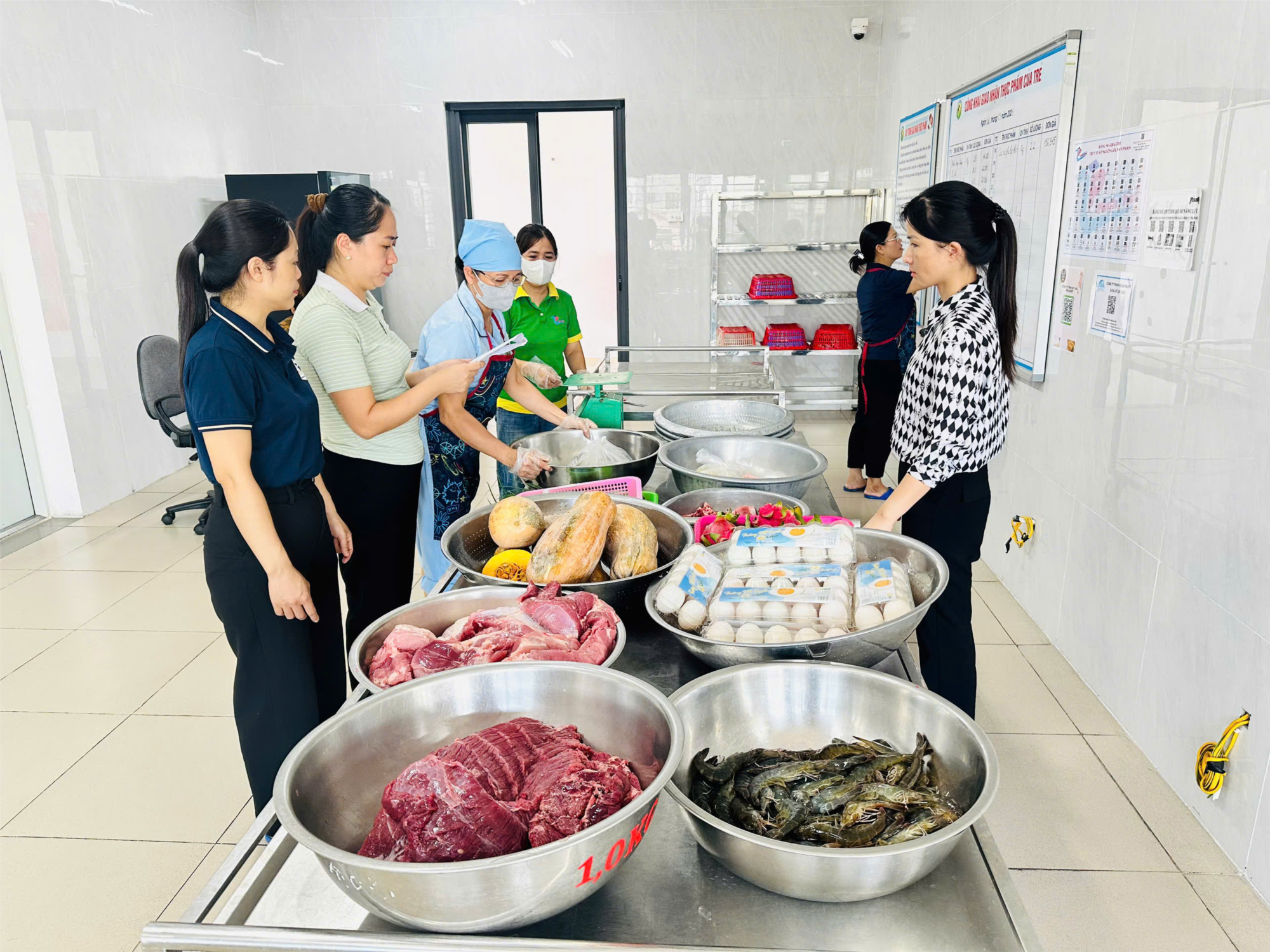 Nhà trường hiện tổ chức ăn bán trú cho 100% trẻ, do đó, việc lựa chọn nguồn thực phẩm đầu vào được thực hiện chặt chẽ. Tất cả các loại thực phẩm đều có nguồn gốc rõ ràng, được cung cấp bởi các đơn vị uy tín, đảm bảo chất lượng và có ký kết hợp đồng theo quy định. Hằng ngày, bộ phận tiếp phẩm thực hiện nghiêm túc việc kiểm thực 3 bước và lưu mẫu thức ăn đầy đủ, đúng quy trình, nhằm đảm bảo an toàn tuyệt đối trong khâu tiếp nhận và chế biến thực phẩm.