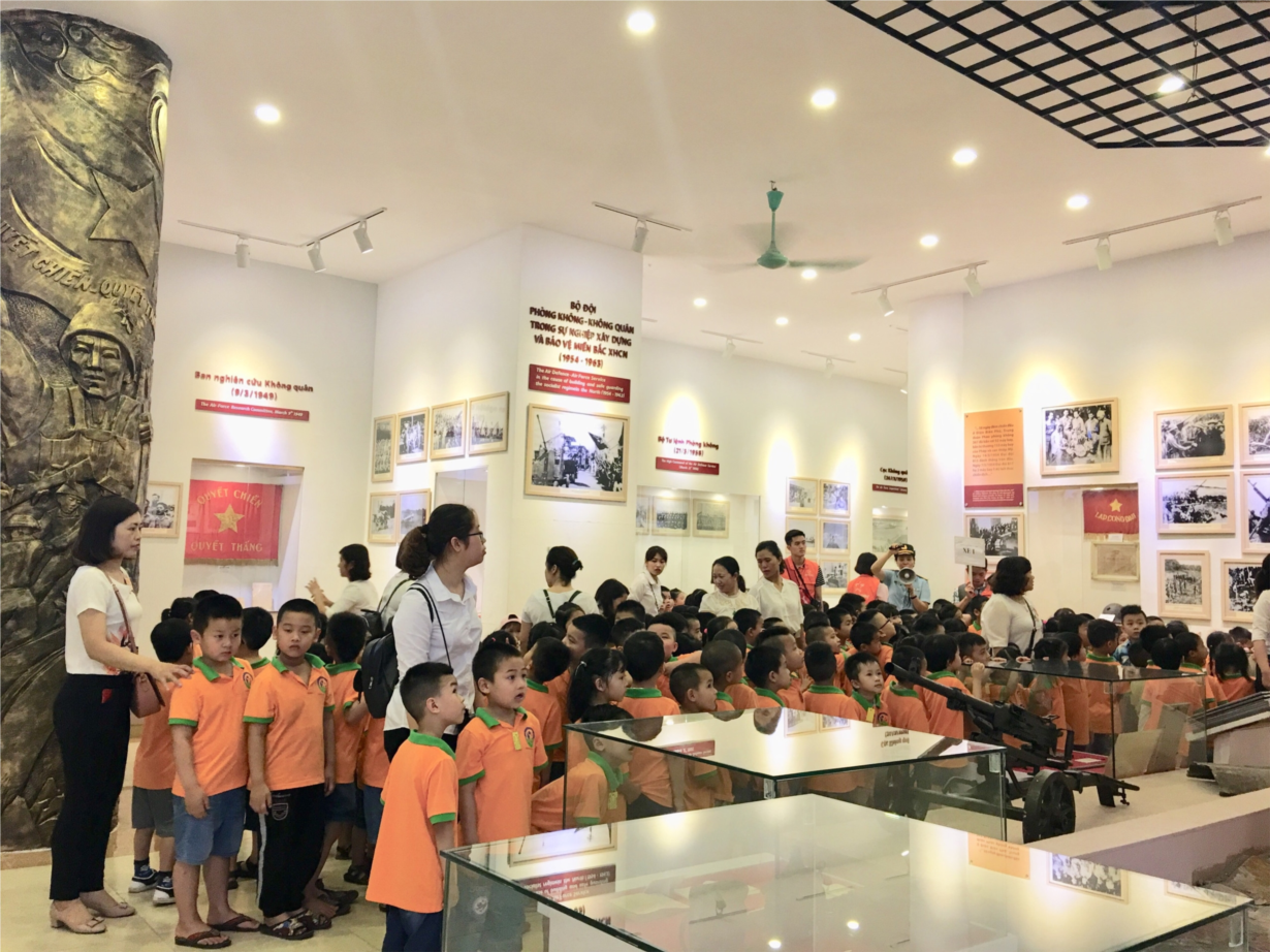 Điểm đến đầu tiên là Bảo tàng trẻ được nghe các cô hướng dẫn viên kể cho nghe các chiến công lừng lẫy và các vật dụng vũ khí chiến đấu của các chú bộ đội Phòng không Không quân. Ở đây các bé thật sự thích thú khi được tận mắt và được sờ ngắm rất nhiều các loại máy bay, tên lửa...