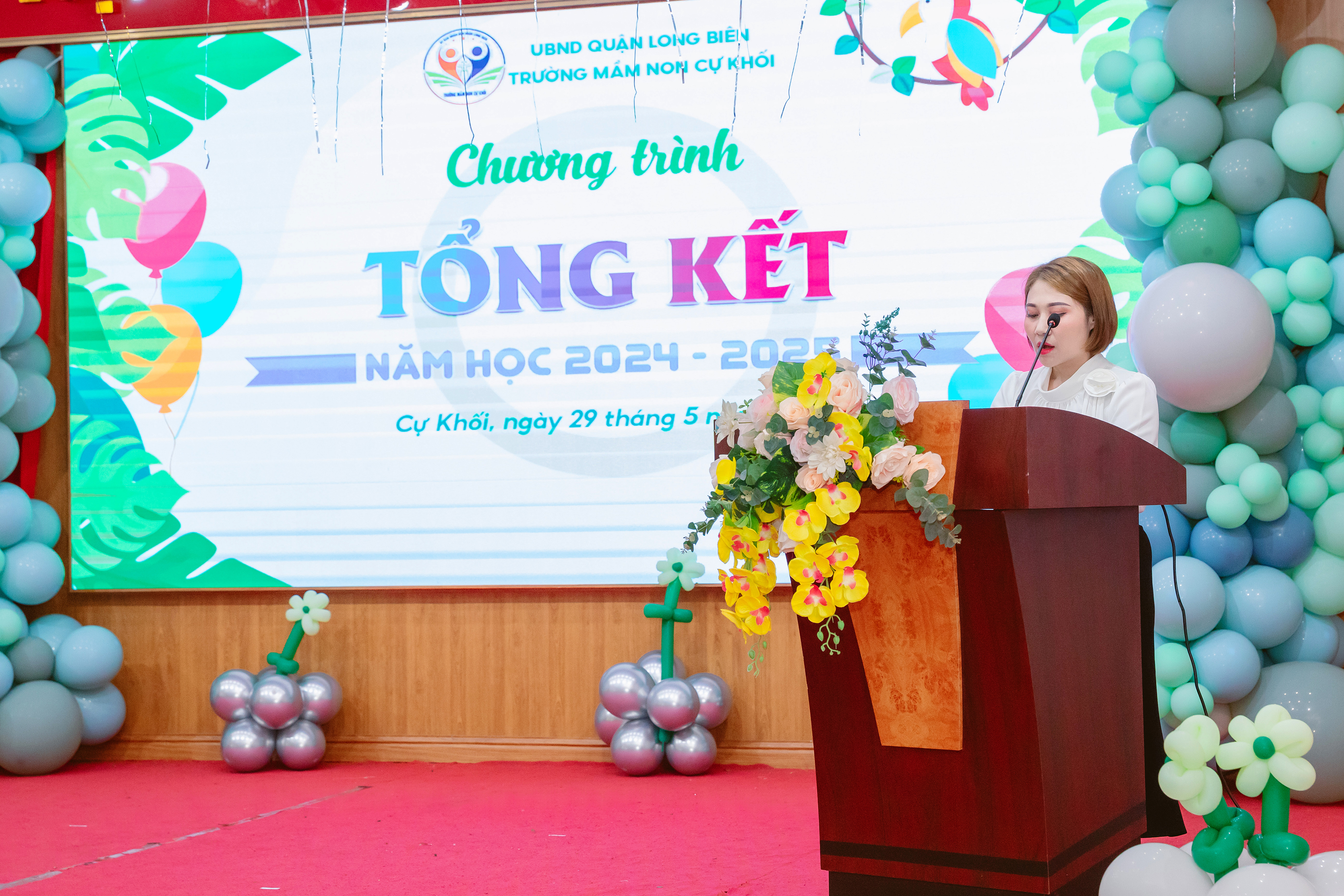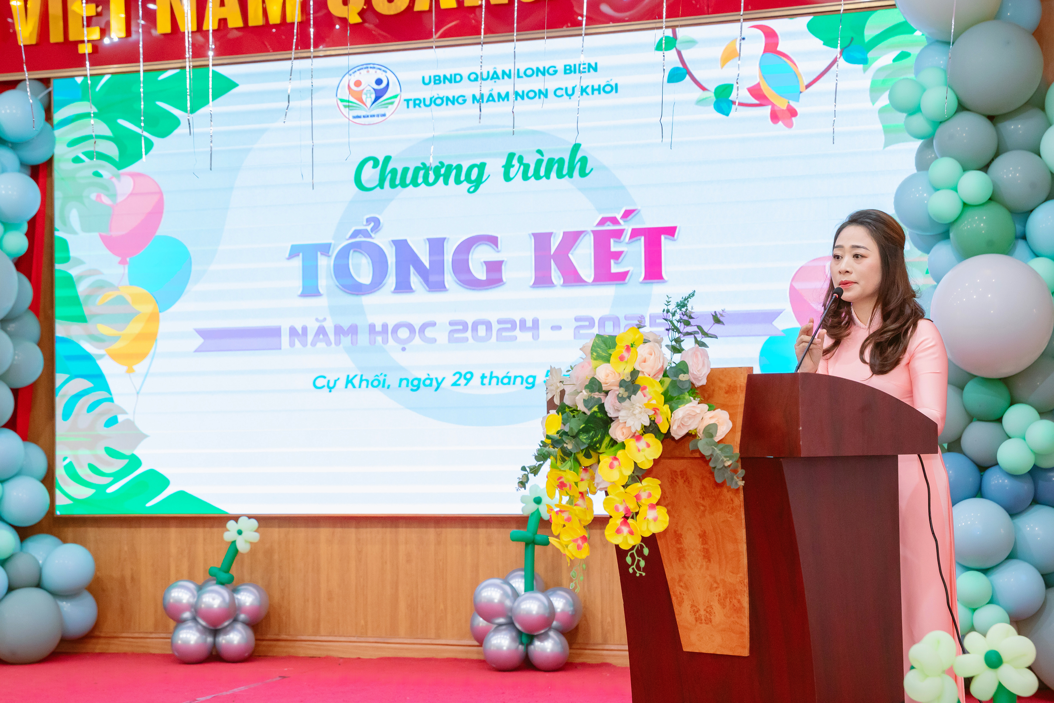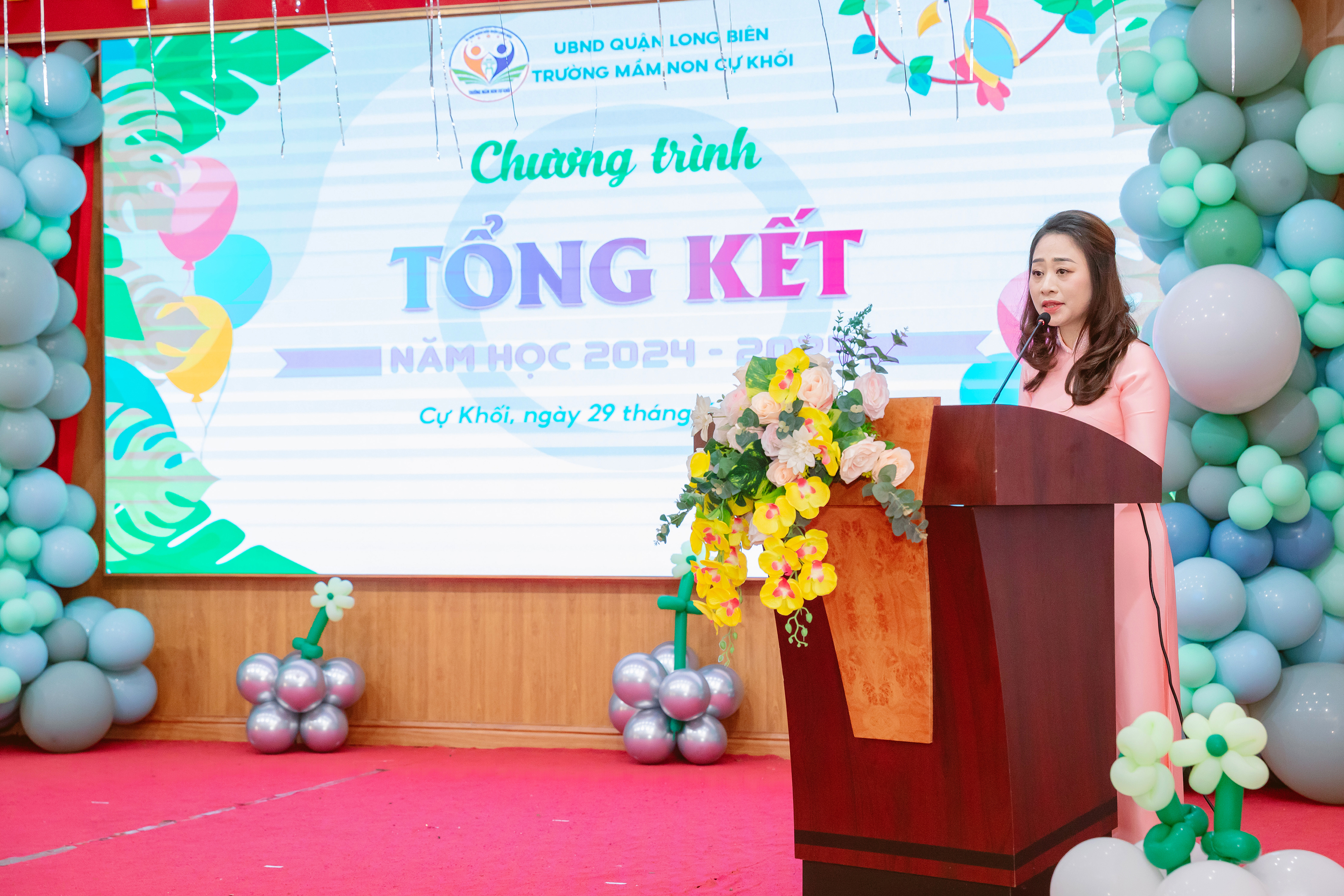 Phát biểu khai mạc buổi lễ, đồng chí Lê Thị Yến - Bí thư chị bộ - Hiệu Trưởng nhà trường đã trình bày báo cáo tổng kết năm học, nêu bật những thành tích nổi bật của nhà trường trong việc duy trì và nâng cao chất lượng giáo dục mầm non, tổ chức hiệu quả các hoạt động trải nghiệm, phát triển toàn diện cho trẻ, cũng như sự phối hợp chặt chẽ với cha mẹ học sinh trong các hoạt động chăm sóc, giáo dục trẻ.
