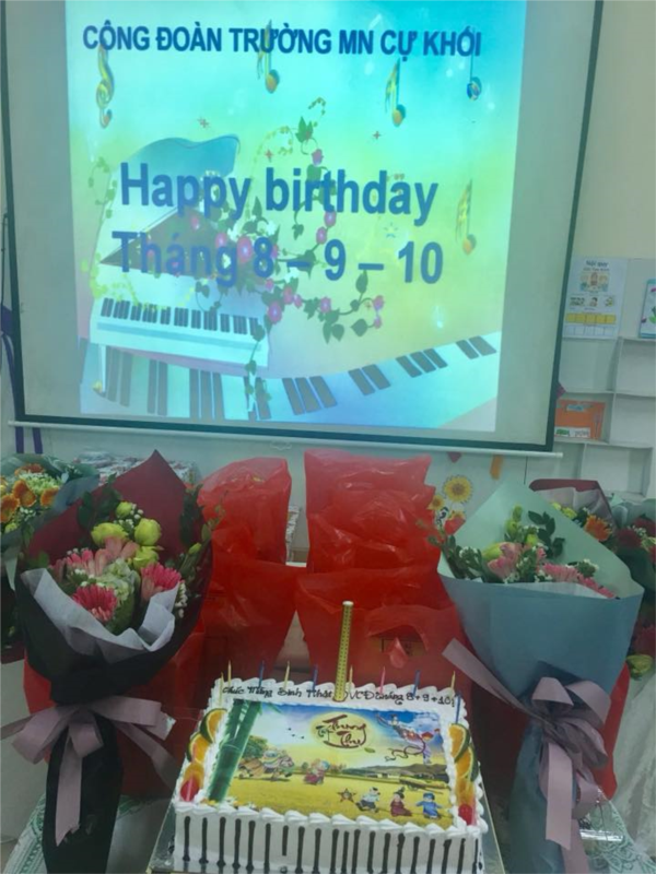 Thực hiện Điều lệ Công đoàn; Thực hiện chủ trương của Ban chấp hành Công đoàn nhiệm kỳ 2016 - 2022 và phương hướng nhiệm vụ công tác Công đoàn năm 2018. Công đoàn Cơ sở Trường MN Cự Khối tiến hành tổ chức chương trình chúc mừng sinh nhật đoàn viên công đoàn tháng 8-9-10.