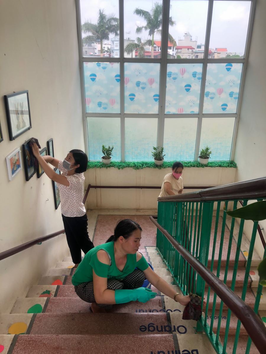 Duy trì nề nếp vệ sinh hằng ngày, tổng vệ sinh hàng tuần, CBGVNV trường mầm non Cự Khối luôn làm tốt nhất các biện pháp phòng chống dịch bệnh. Toàn khuôn viên được khử khuẩn, dọn vệ sinh sạch sẽ, cắt tỉa cây gọn gàng trước thềm năm học mới.Các giá kệ đồ dùng đồ chơi, mặt sàn, tay nắm cửa, lan can hành lang, cầu thang được lau chùi, khử khuẩn và sắp xếp gọn gàng tạo hứng thú đón chào các bé đến lớp.
