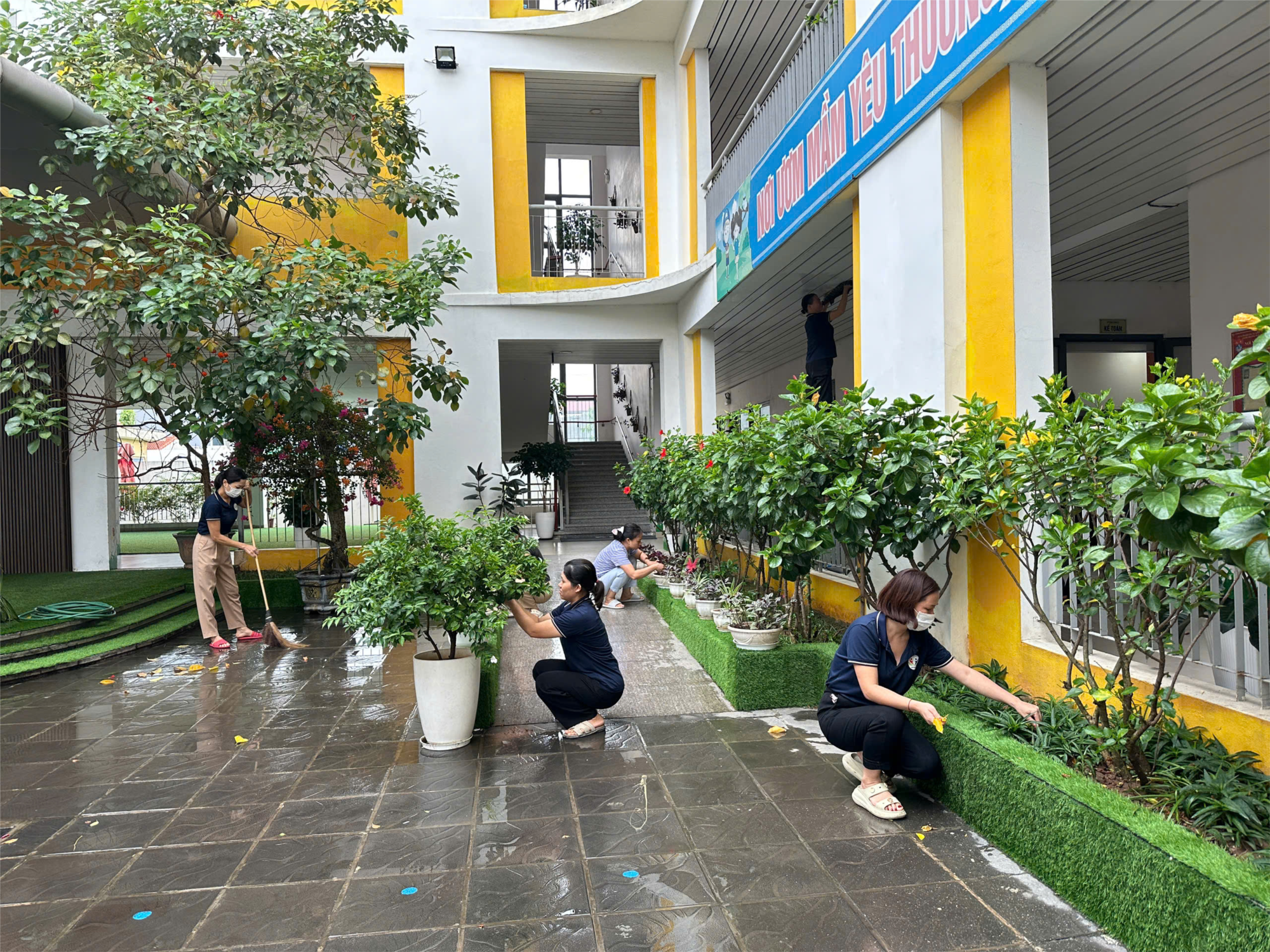 Bên cạnh đó, nhà trường cũng thường xuyên tổ chức các buổi tổng vệ sinh toàn trường, huy động sự tham gia tích cực của toàn thể CBGVNV, đặc biệt có sự hưởng ứng sôi nổi từ phía phụ huynh học sinh và trẻ. Những buổi lao động tập thể không chỉ góp phần cải thiện cảnh quan nhà trường mà còn nâng cao tinh thần trách nhiệm, ý thức cộng đồng và tinh thần đoàn kết của tập thể nhà trường.