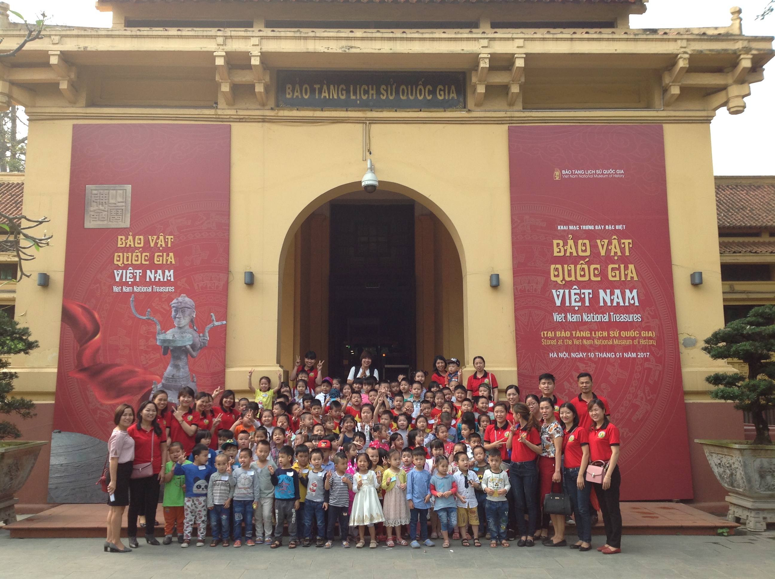 Điểm đến đầu tiên đó là Bảo tàng lịch sử. Tại đây, trẻ được các cô chú hướng dẫn, tìm hiểu về lịch sử, được tham quan hệ thống trưng bày của bảo tàng lịch sử được tận mắt nhìn thấy những hiện vật như: Trống đồng Đông Sơn, sách đồng, con dấu, bình phong cổ…...Sự thích thú tìm tòi, sự hứng khởi, ngạc nhiên và niềm vui hiện rõ trên khuôn mặt tươi vui của các con. Được sự hướng dẫn nhiệt tình của các cô chú hướng dẫn viên các con đã biết và hiểu được Bảo tàng lịch sử là nơi lưu giữ những hiện vật, phản ánh các nền văn hóa, lịch sử dựng nước và giữ nước của người Việt từ thuở ban đầu khai sang đến ngày ra đời nước Việt Nam Dân Chủ Cộng Hòa.