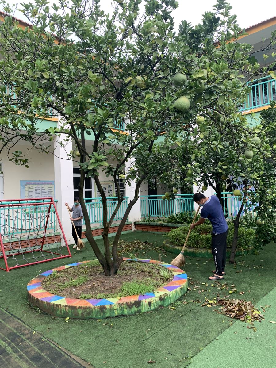 Nhà trường triển khai vệ sinh sạch sẽ môi trường trong và ngoài lớp; phát quang bụi rậm các khu vực xung quanh trường, khơi thông cống rãnh; thu dọn sạch sẽ các vật dụng phế thải, chai lọ, ống bơ, rác, cọ rửa thùng rác; lau chùi các bồn cây, chậu cảnh, cắt tỉa cành cây; quét dọn sân trường, vệ sinh hành lang, khu tiểu cảnh các tầng và các khu vực khuôn viên trường học và cổng trường; lật úp các dụng cụ có chứa nước như lốp xe, khay chứa nước ở các chậu cây; rắc vôi bột vào các nắp cống… không để tình trạng nước đọng lâu ngày là môi trường cho loăng quăng bọ gậy sinh sôi. Trong quá trình thực hiện, toàn bộ cán bộ nhân viên đã nghiêm túc thực hiện đúng quy tắc 5k phòng chống dịch bệnh.